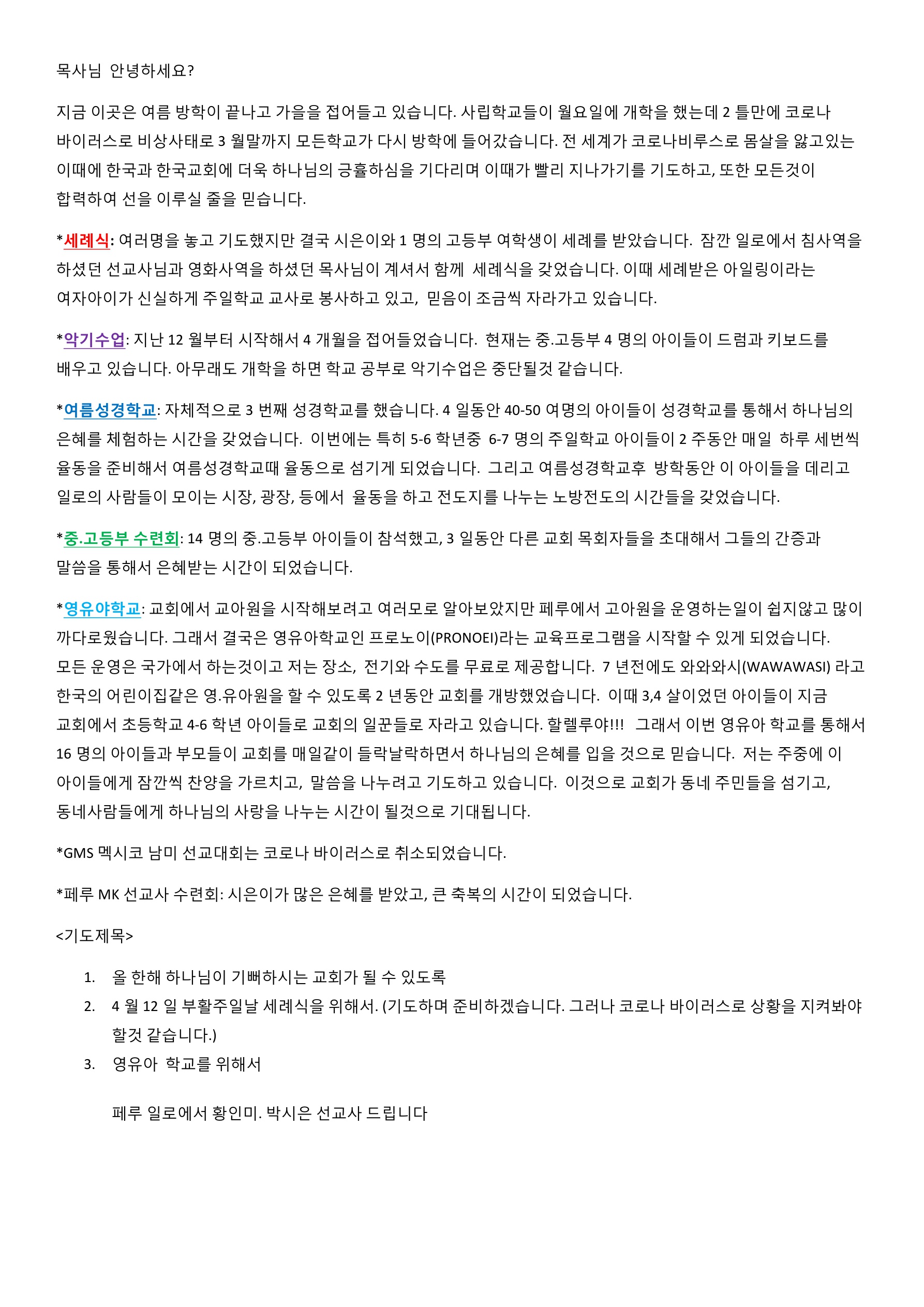 페루 황인미 선교사님 기도편지