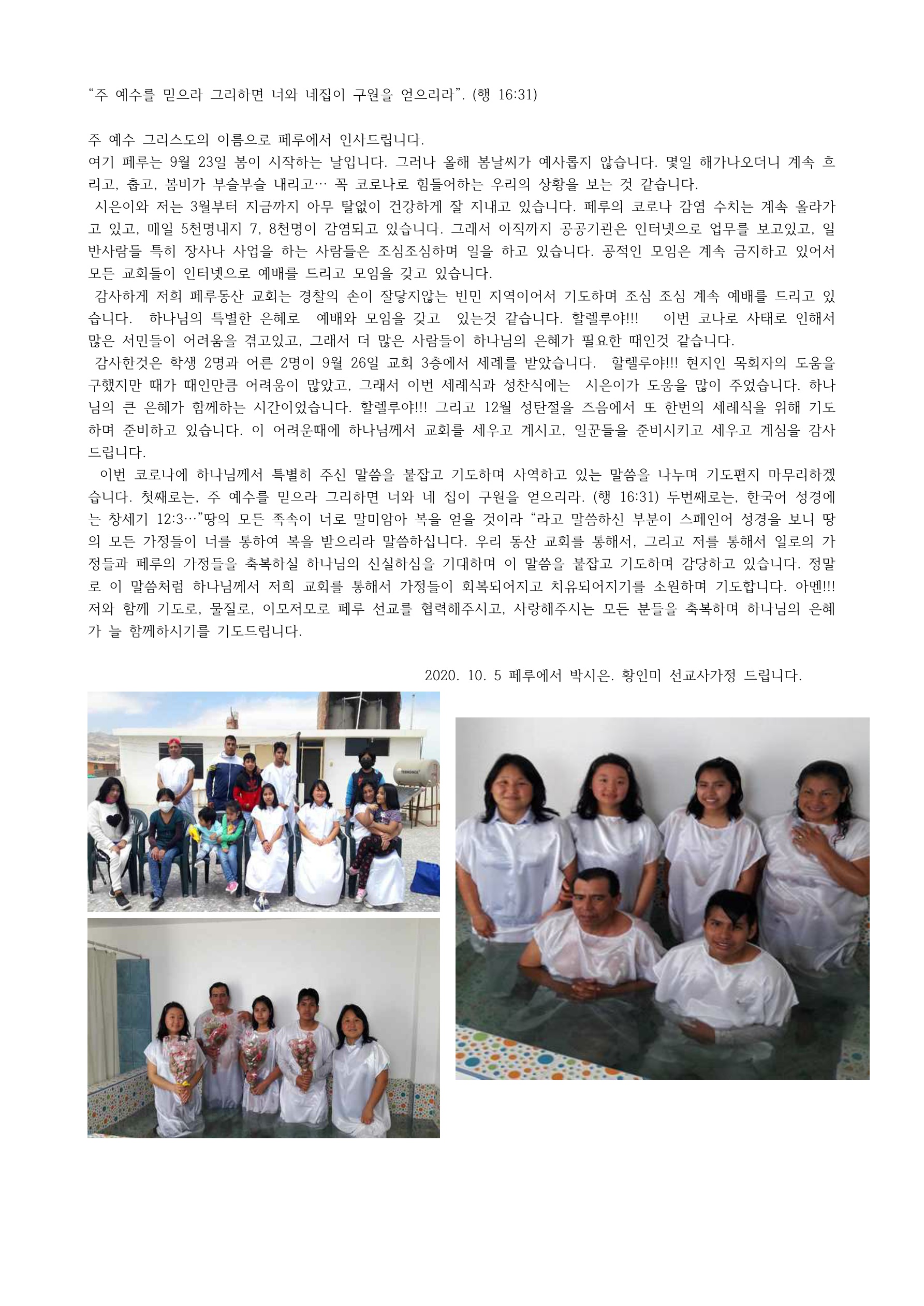 [페루선교] 페루 황인미 선교사님 기도편지