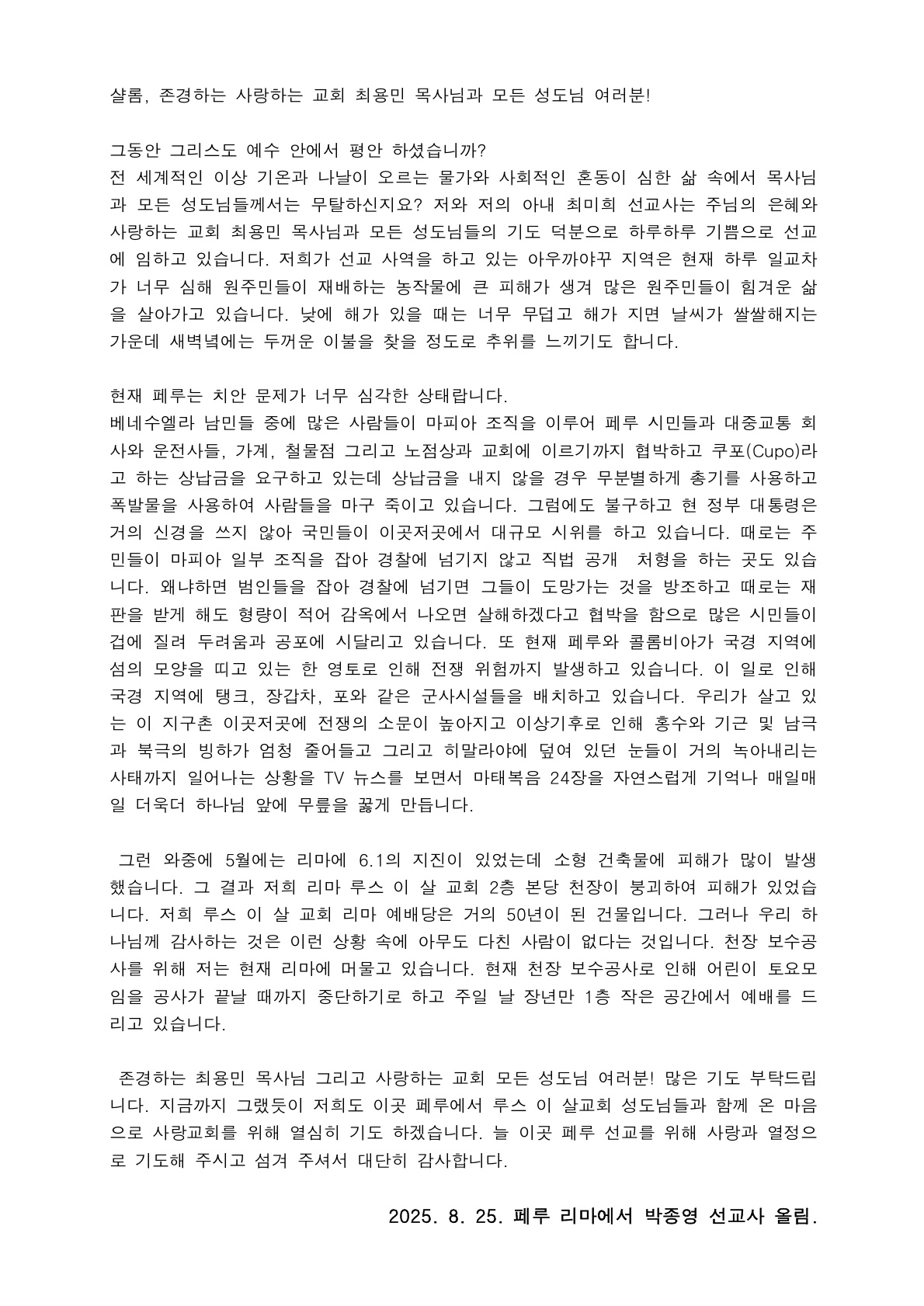 [페루선교] 박종영선교사님 선교편지입니다.