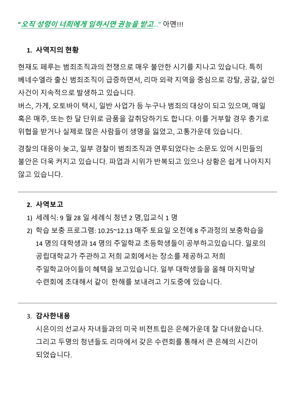 [페루선교] 황인미선교사님 사역보고 선교편지(25.11.21)